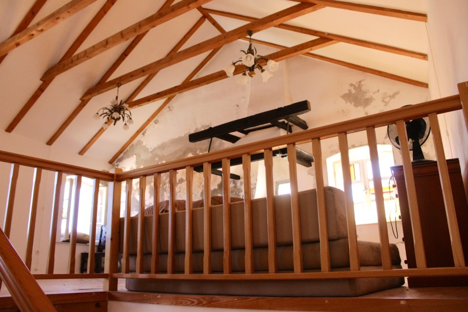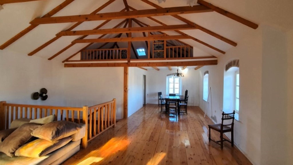 The second floor consists of a spacious living room with an indoor fireplace that enhances the unique atmosphere. The floor also includes a beautifully decorated wooden gallery space and an additional bedroom.